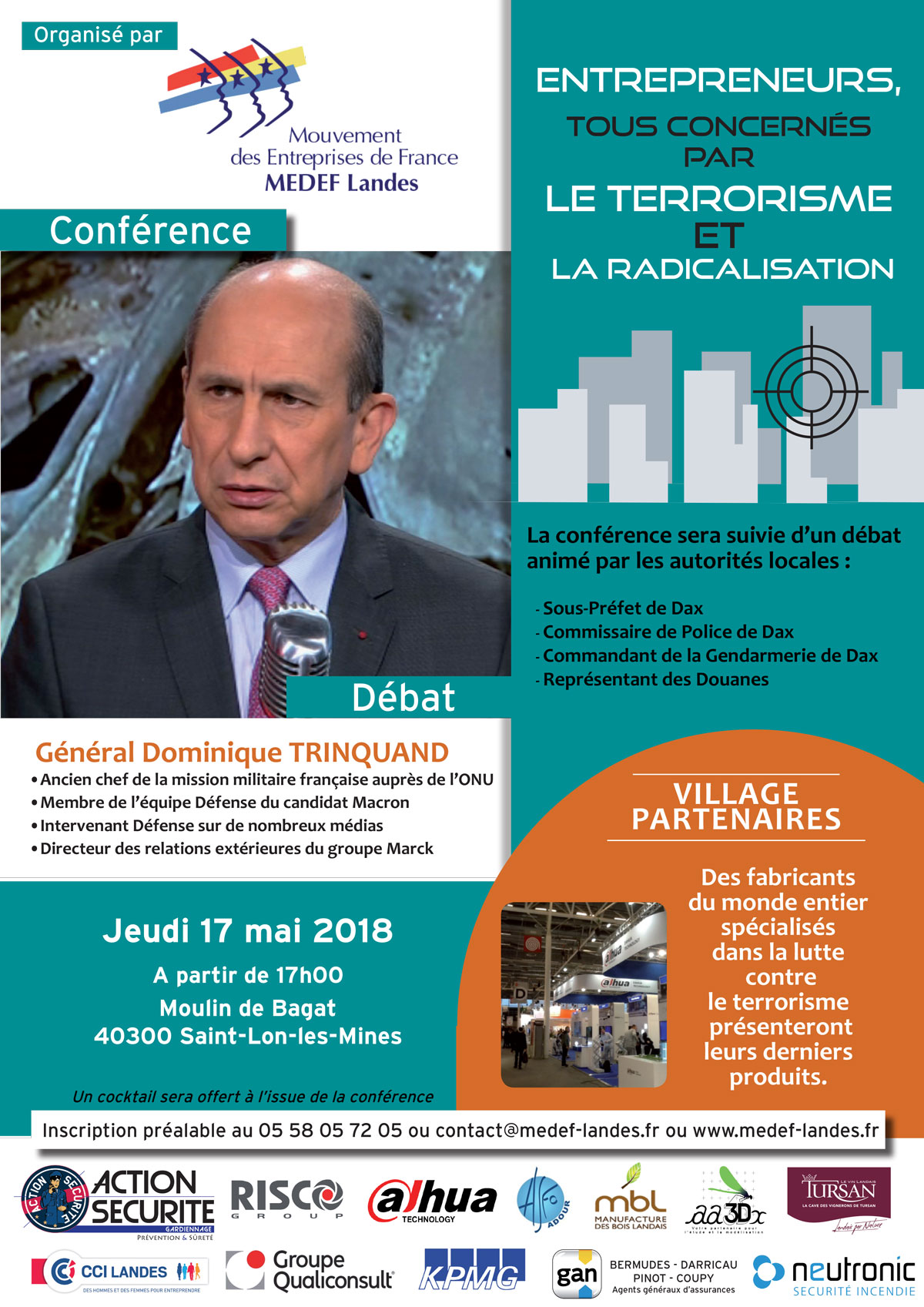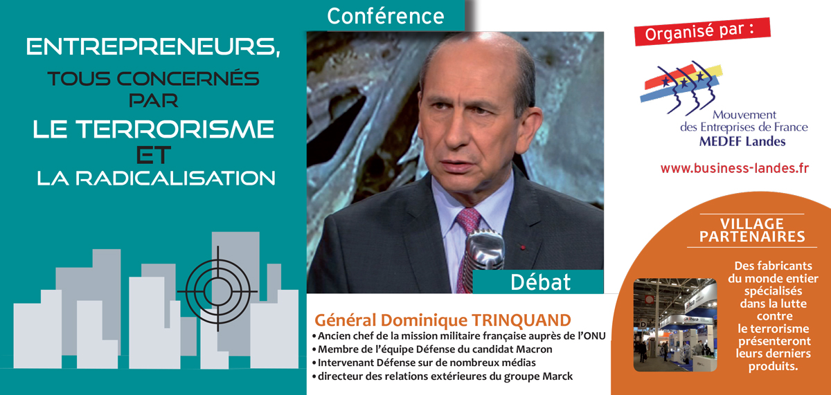 Action Sécurité, en partenariat avec Landes Medef, vous propose le 17 Mai 2018 une conférence sur le thème des entrepreneurs face au terrorisme et à la radicalisation.